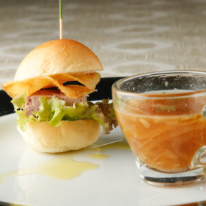 ・蝦夷鹿のパテ(ミニバーガー仕立て)とあめ色玉ねぎのスープ